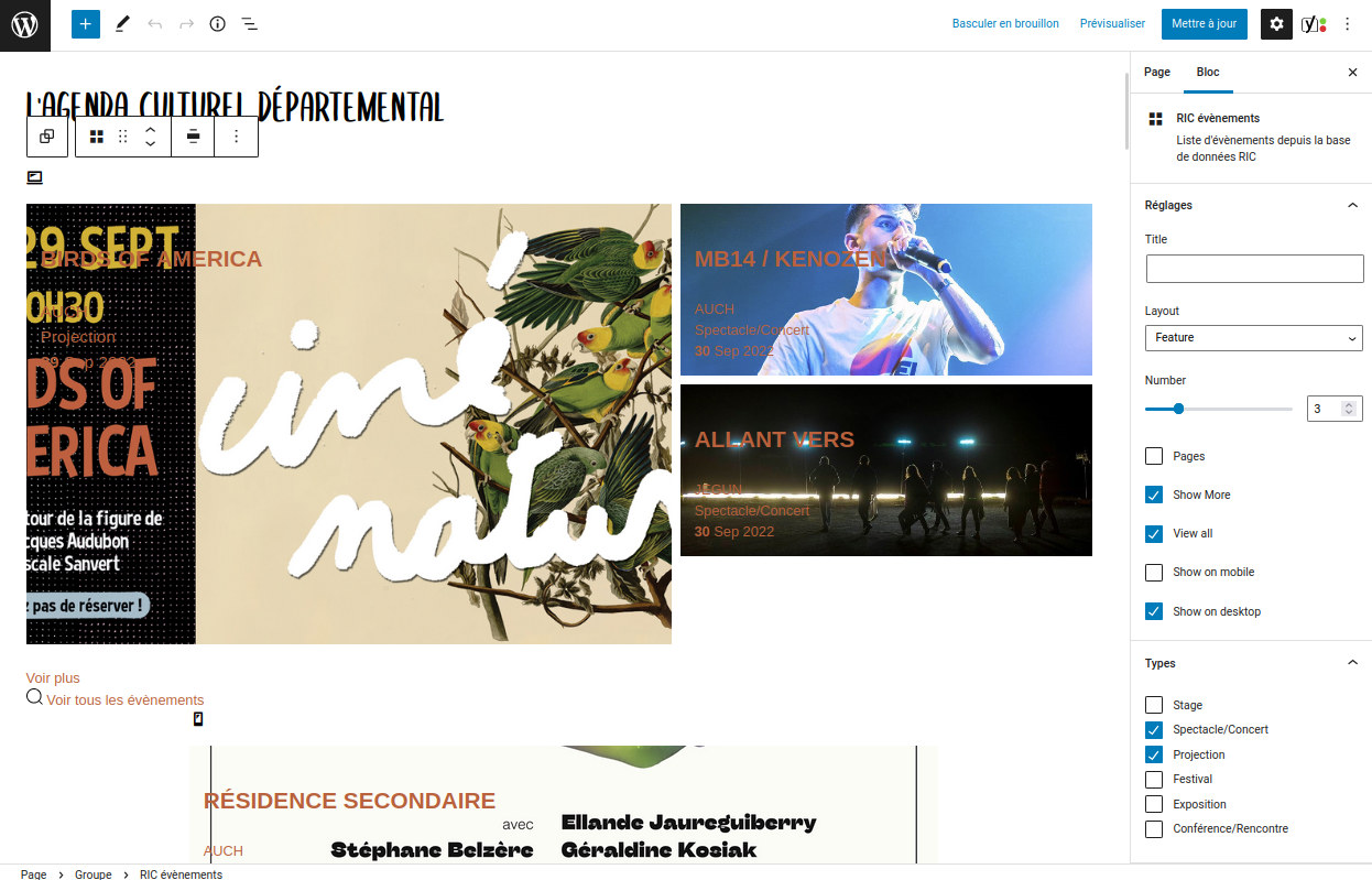Dans votre éditeur de pages ou d’articles de WordPress, utilisez le bloc Gutenberg « RIC événements » pour afficher les événements du RIC.