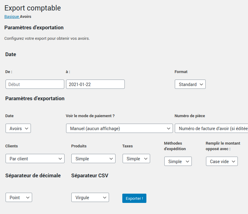 To export your orders to your accounting software (EBP, Ciel, or other), simply go to « WooCommerce > Accounting Export ».