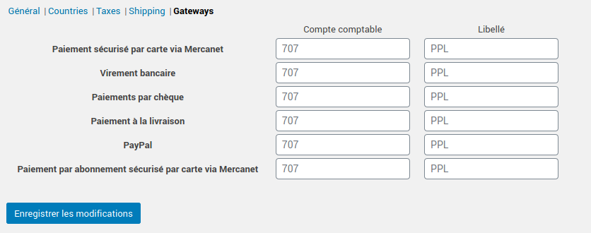You can then define your accounting codes for each type of accounting information: products, taxes, shipping costs, payment methods, accounting book, cost accounting, depending on the payment methods, order status etc.