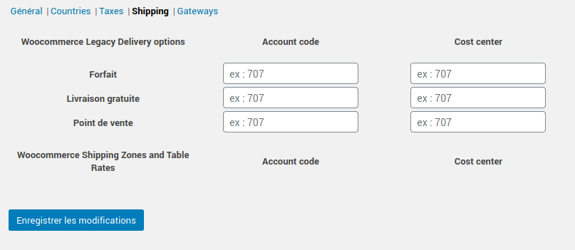 There are 5 tabs available, allowing you to edit the specific accounting codes for the different settings you have defined in WooCommerce: